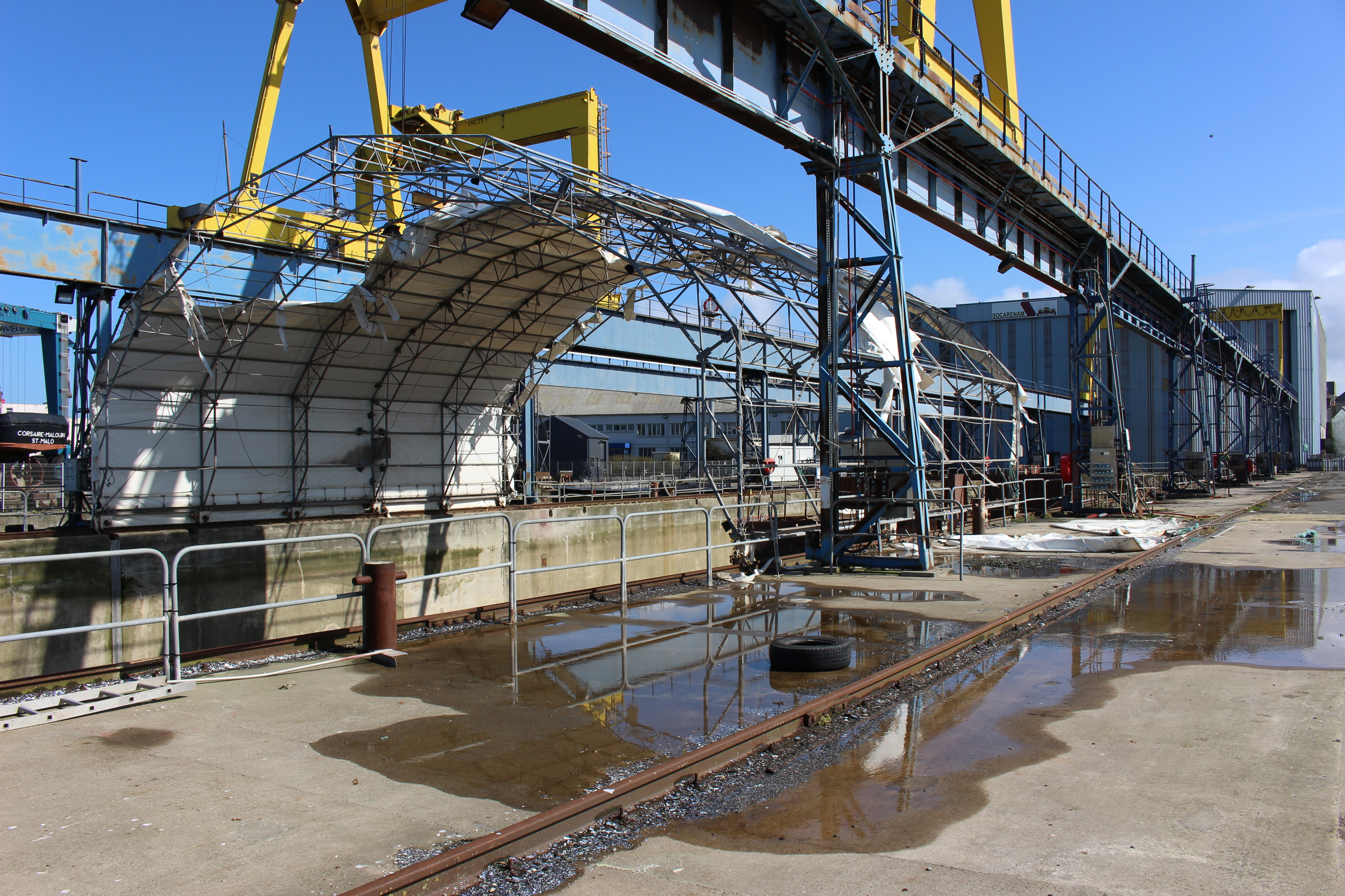 Bassin 9 : Longueur 313m - Largeur 35m - Hauteur d'eau de 5m à 13m - Portique de 405T - 2 Grues (120T et 15T)